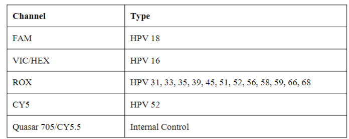 | Specificity | There is no cross-reactivity with Ureaplasma urealyticum, Chlamydia trachomatis of reproductive tract, Candida albicans, Neisseria gonorrhoeae, Trichomonas vaginalis, Mold , Gardnerella and other HPV types not covered by the kit. |