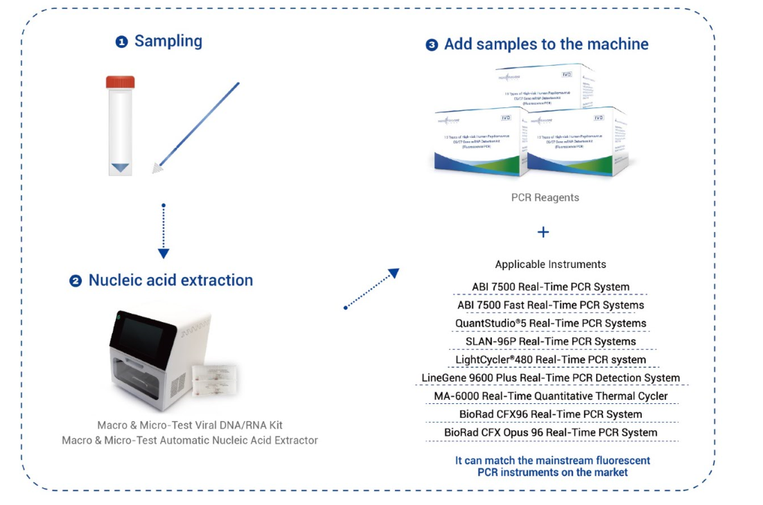 Recommended extraction reagent: Macro & Micro-Test Viral DNA/RNA Kit (HWTS-3020-50-HPV15) by Jiangsu Macro & Micro-Test Med-Tech Co., Ltd. The extraction should be conducted strictly according to the instructions for use . The recommended elution volume is 50μL. If the sample is not completely digested, return it to step 4 for redigesting. And then test according to the instructions for use.
