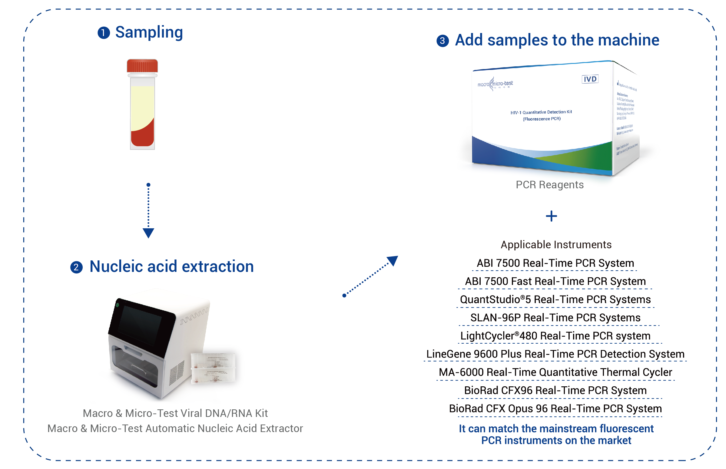 Recommended extraction reagents: Macro & Micro-Test Virus DNA/RNA Kit (HWTS-3017) (which can be used with Macro & Micro-Test Automatic Nucleic Acid Extractor (HWTS-EQ011)) by Jiangsu Macro & Micro-Test Med-Tech Co., Ltd.. The extraction should be conducted according to the instruction manual. The sample volume is 300μL, the recommended elution volume is 80μL.