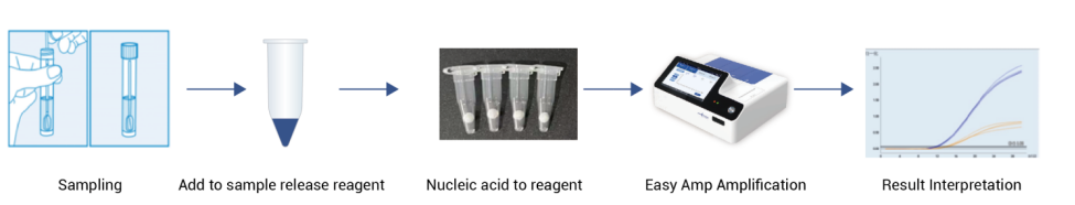 Easy operation: Lysed sample added to the lyophilized reagent tube for direct on-demand amplification enabled by independent modules of Easy Amp System;
