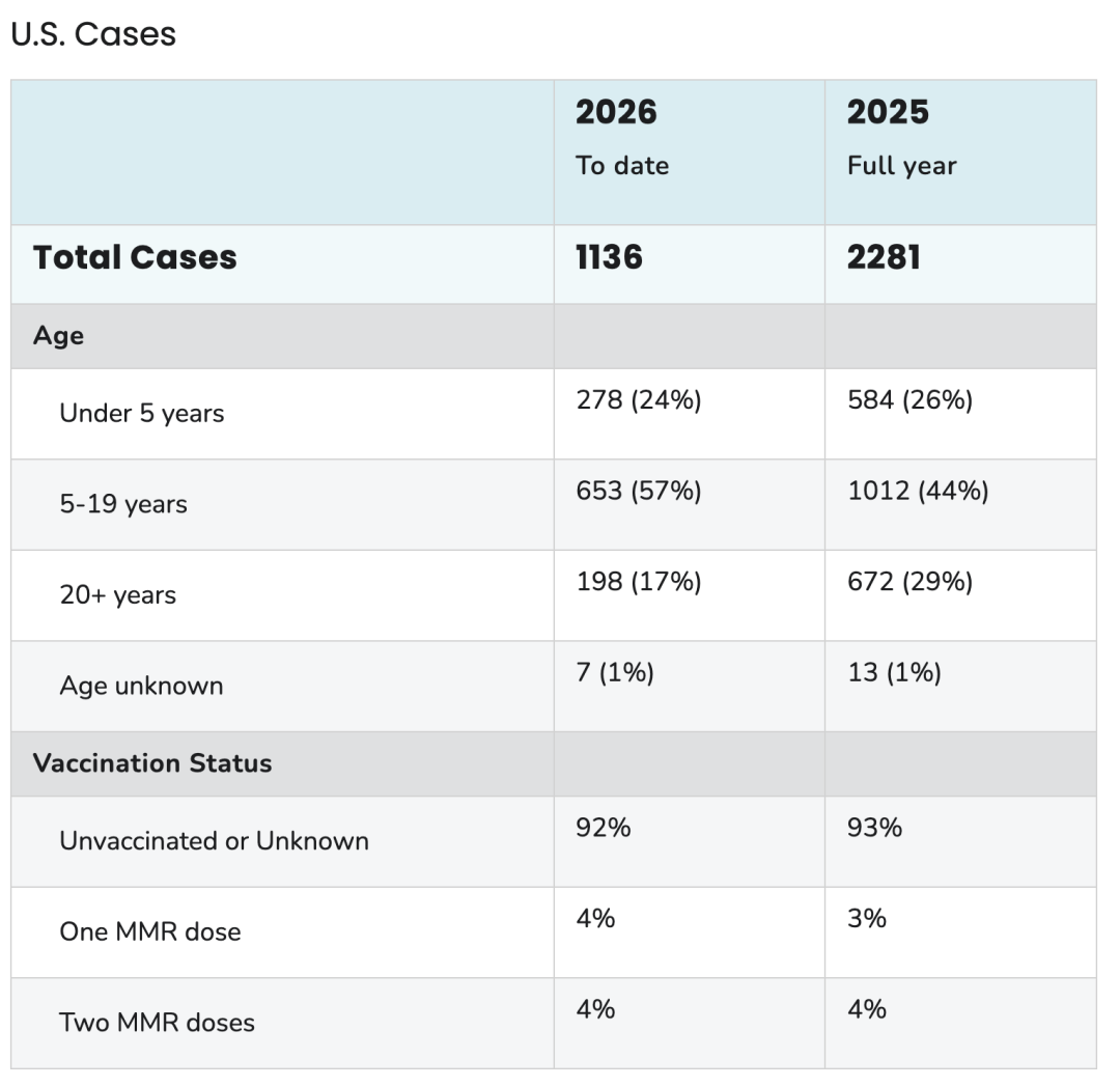 As of early 2026, the United States has reported more than 1,100 confirmed measles cases, already exceeding the pace seen at the same time last year. Nearly 90% of cases are linked to ongoing outbreaks, and infections have been identified across more than two dozen states. The majority of cases involve individuals who were unvaccinated or whose vaccination status is unknown.