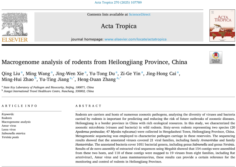 A recent metagenomic study has revealed a remarkably diverse spectrum of viruses and bacteria carried by rodents in Heilongjiang Province, including Lassa virus, Amur virus, Salmonella, and Yersinia pestis.