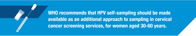 Where HPV tests are available, programmes should consider whether the inclusion of HPV self-sampling as a complementary option within their existing approaches to cervical screening and treatment could address gaps in current coverage.